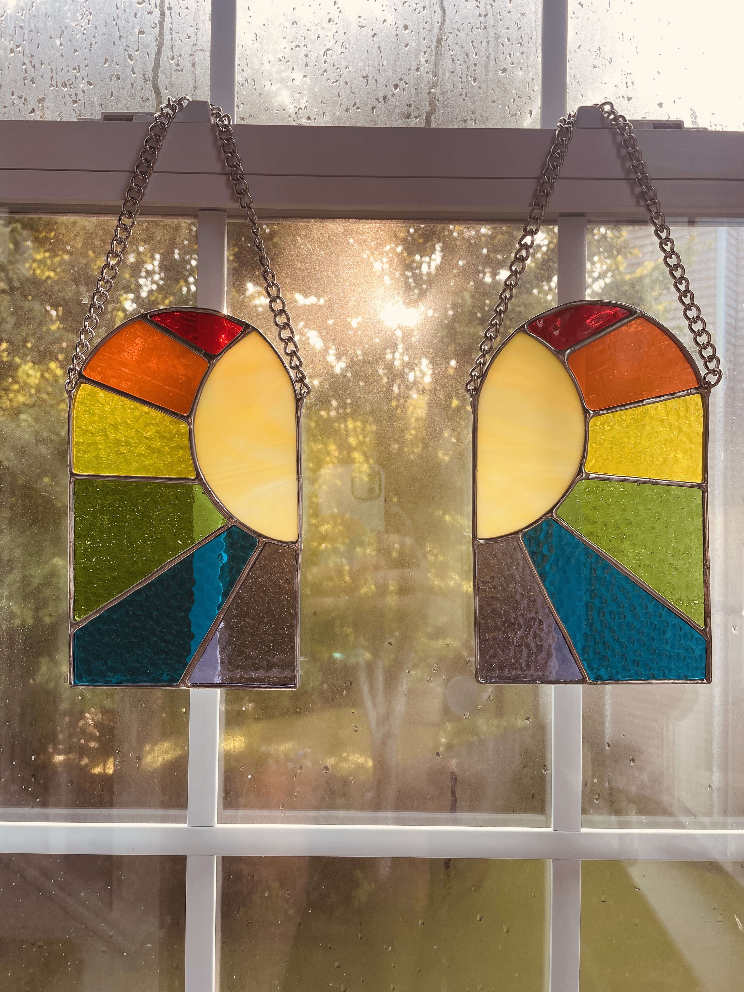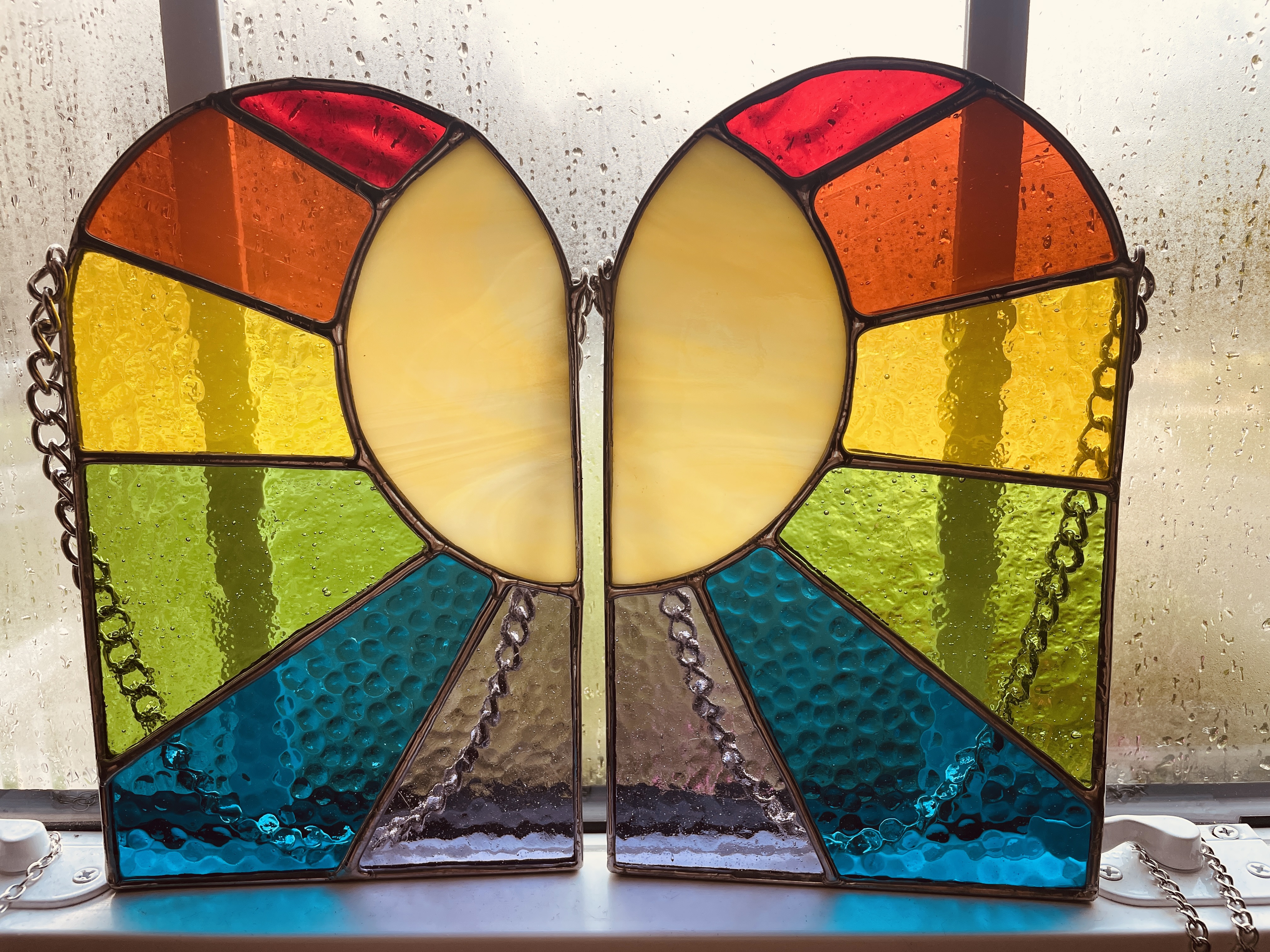 After a few weeks of conversation, and a delayed start from me–life can really get in the way of art, right?–the rainbow panels are polished and ready to head home with C. Here comes the sun, just in time for Summer storms. Below are a few more images of the set before I wrap them up for the journey.